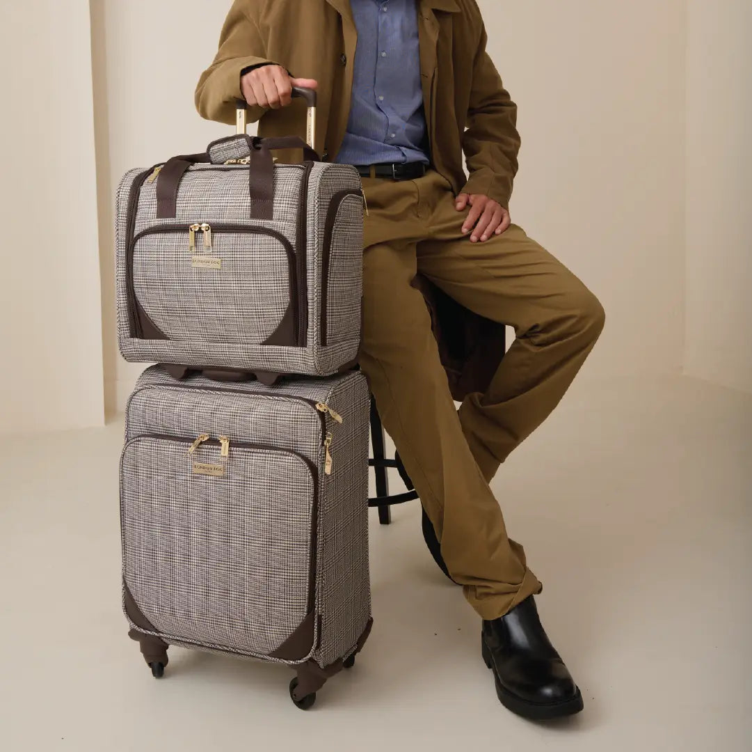 The London Fog Camberley range features a lightweight premium Prince of Wales plaid body material. Lightweight branded telescopic handle with locking push button. Padlock-compatible branded interlocking zip pullers. Ergonomic top carrying handles, fully branded interior lining with gold finish hardware. 2 Smooth glide spinner wheels for ease of transportation.