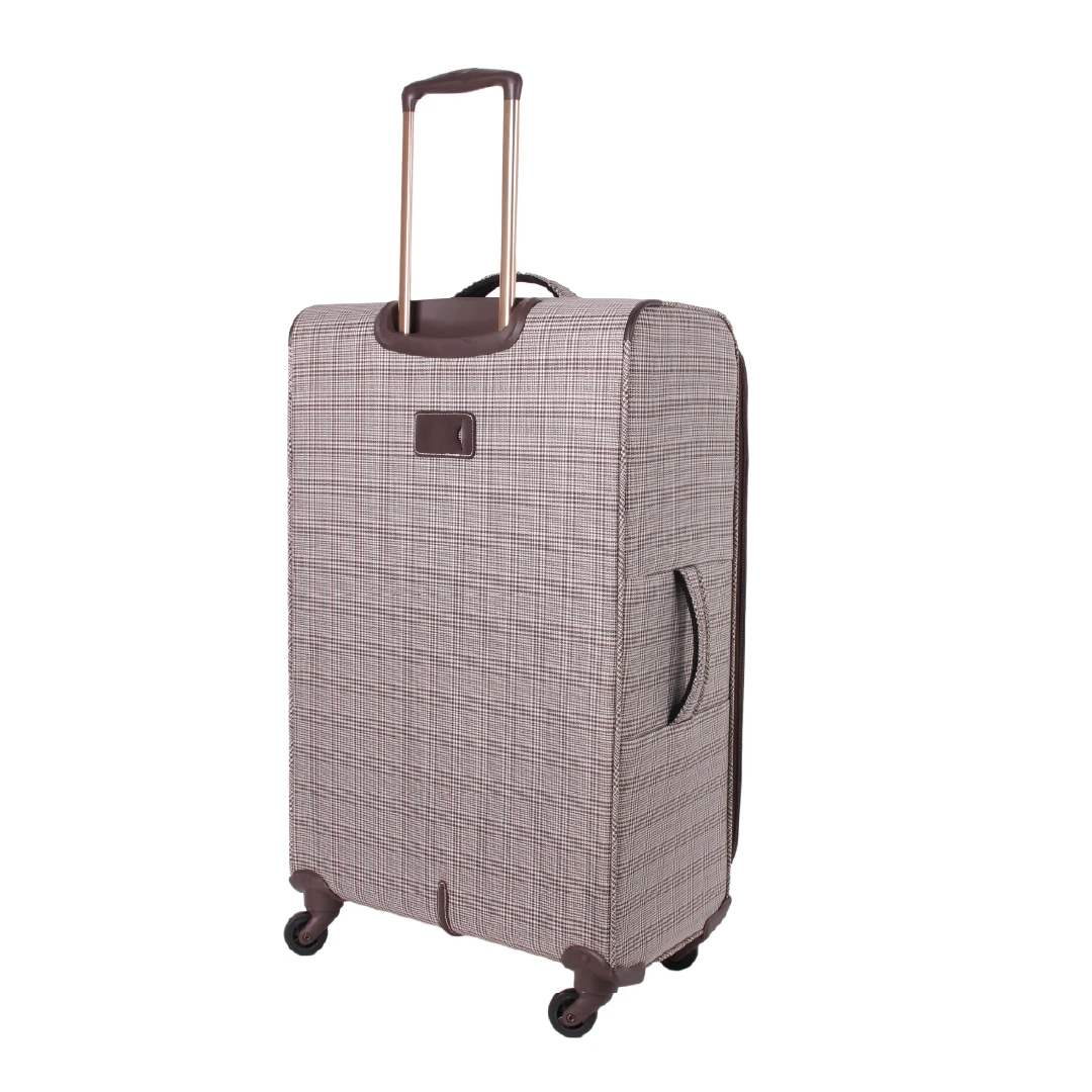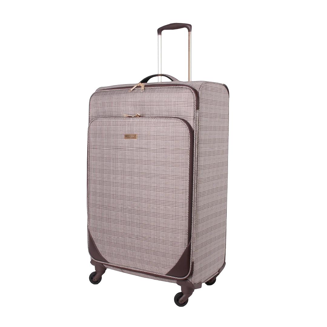 The London Fog Camberley range features a lightweight premium Prince of Wales plaid body material. Lightweight branded telescopic handle with locking push button. Padlock-compatible branded interlocking zip pullers. Ergonomic top carrying handles, fully branded interior lining with gold finish hardware. 4 Smooth glide spinner wheels for ease of transportation.