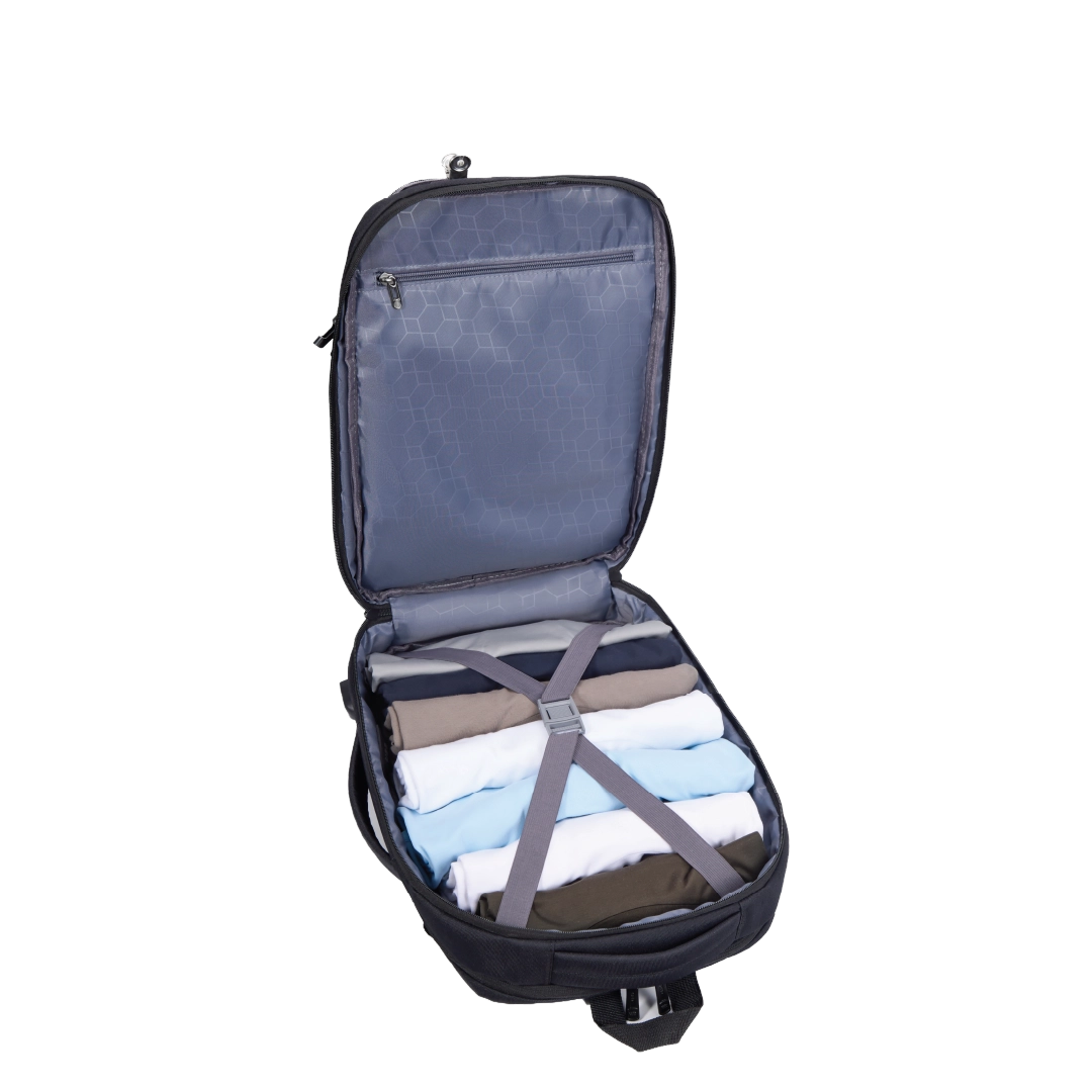 Spacious main compartment with clothing retention straps, internal zipped pocket, multiple organiser sections