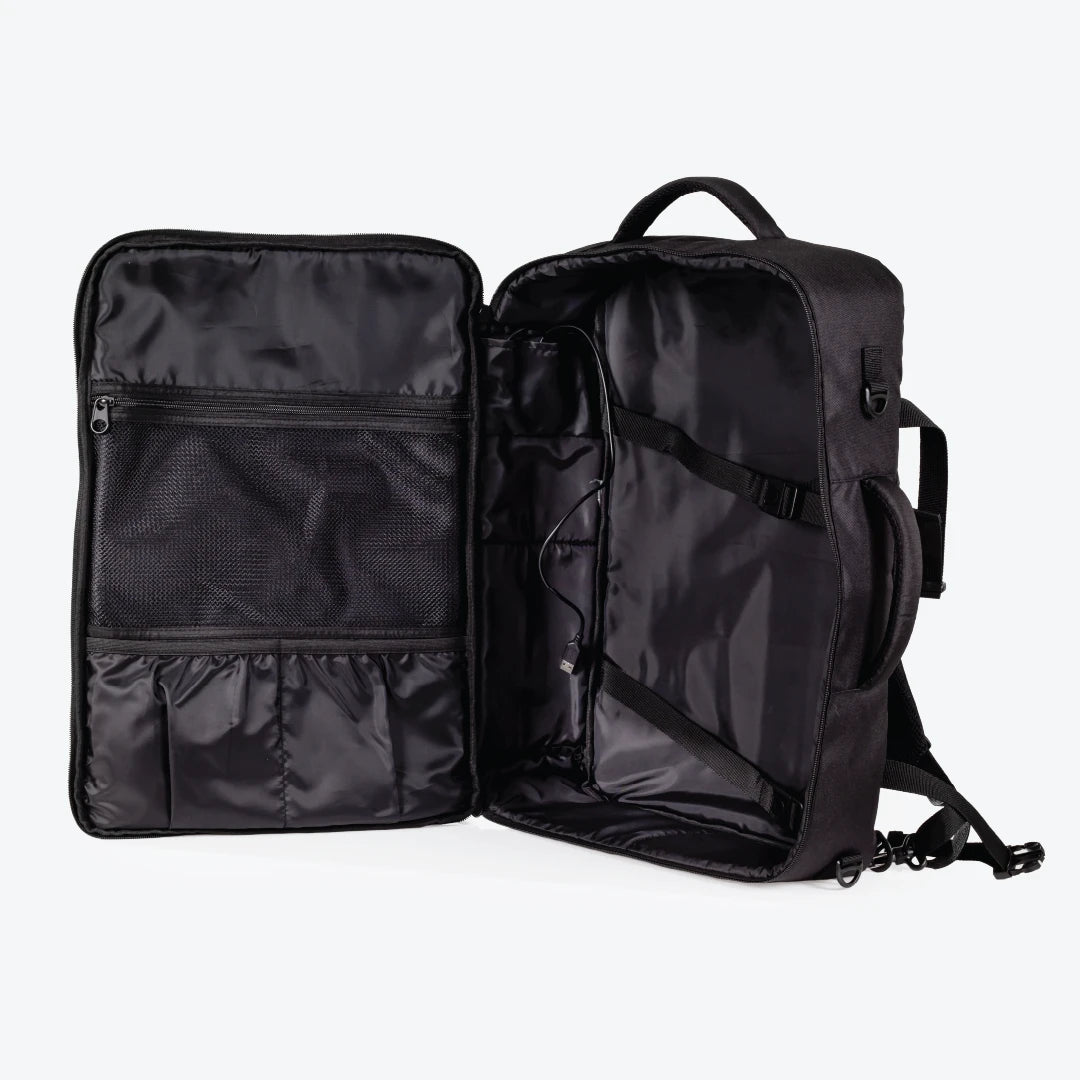 The suitcase-style opening provides easy-access to a large interior, making your packing and organising effortless. The built-in charging device also keeps your devices powered throughout your journey.
